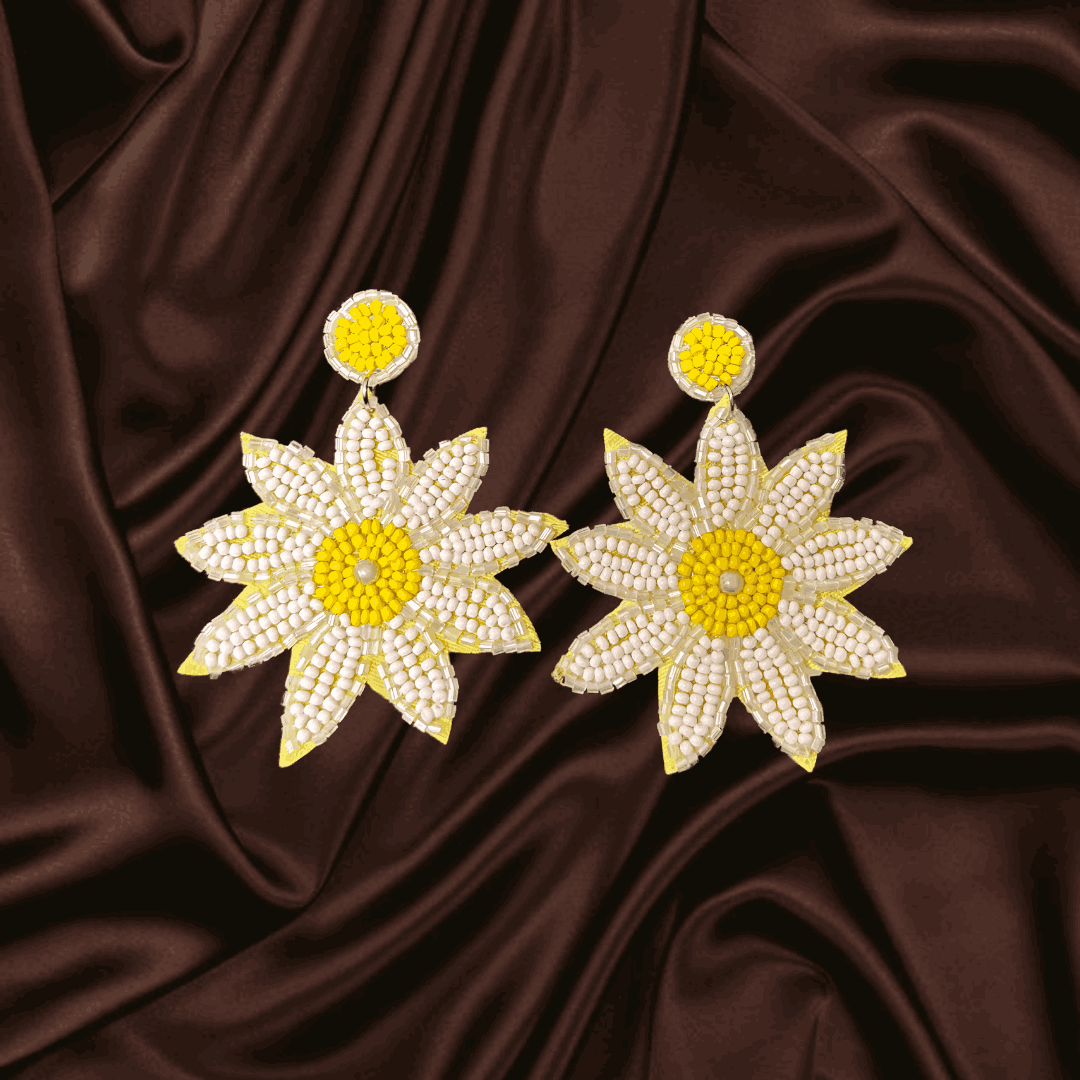 Daisy Drop Earrings are meticulously hand-beaded to create delicate daisy motifs in radiant yellow and soft ivory hues. Each petal is thoughtfully crafted, capturing the lightness and life of wild jasmine fields and the breezy laughter of sunny days. The artistry and attention to detail ensure that every pair is a unique expression of craftsmanship and cheerful design.