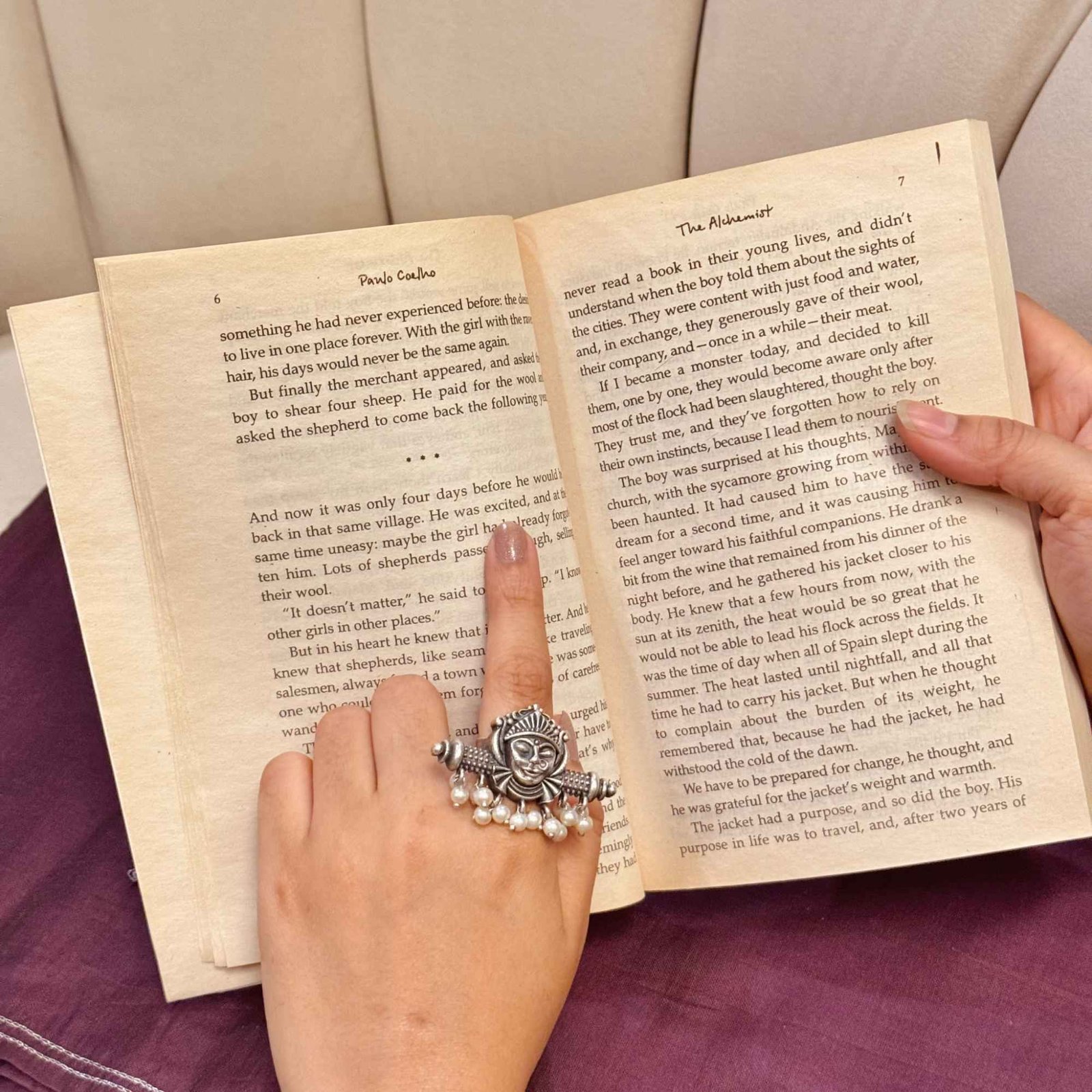 The elongated rectangular base features a raised sun face, masterfully designed to catch attention and reflect a deep connection to tradition. Adding a delicate touch of elegance, the ring is adorned with faux pearl danglers that sway gently with your movements, lending the piece an ethereal grace. This blend of tribal spirit and celestial symbolism makes the Devi Drishti Ring not just an accessory, but a statement of soulful style and meaningful wear.