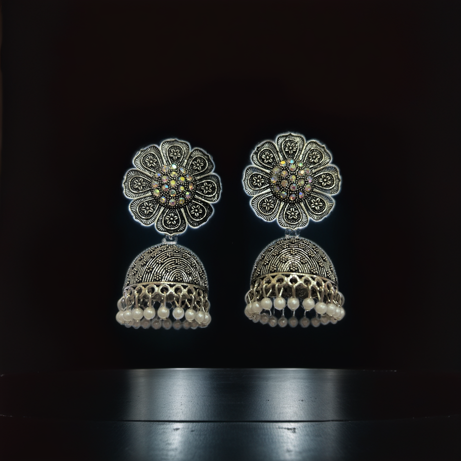Material: Made from high-quality oxidized silver, these jhumkas feature multi-colored stone detailing and pearl drops that enhance the intricate floral design.