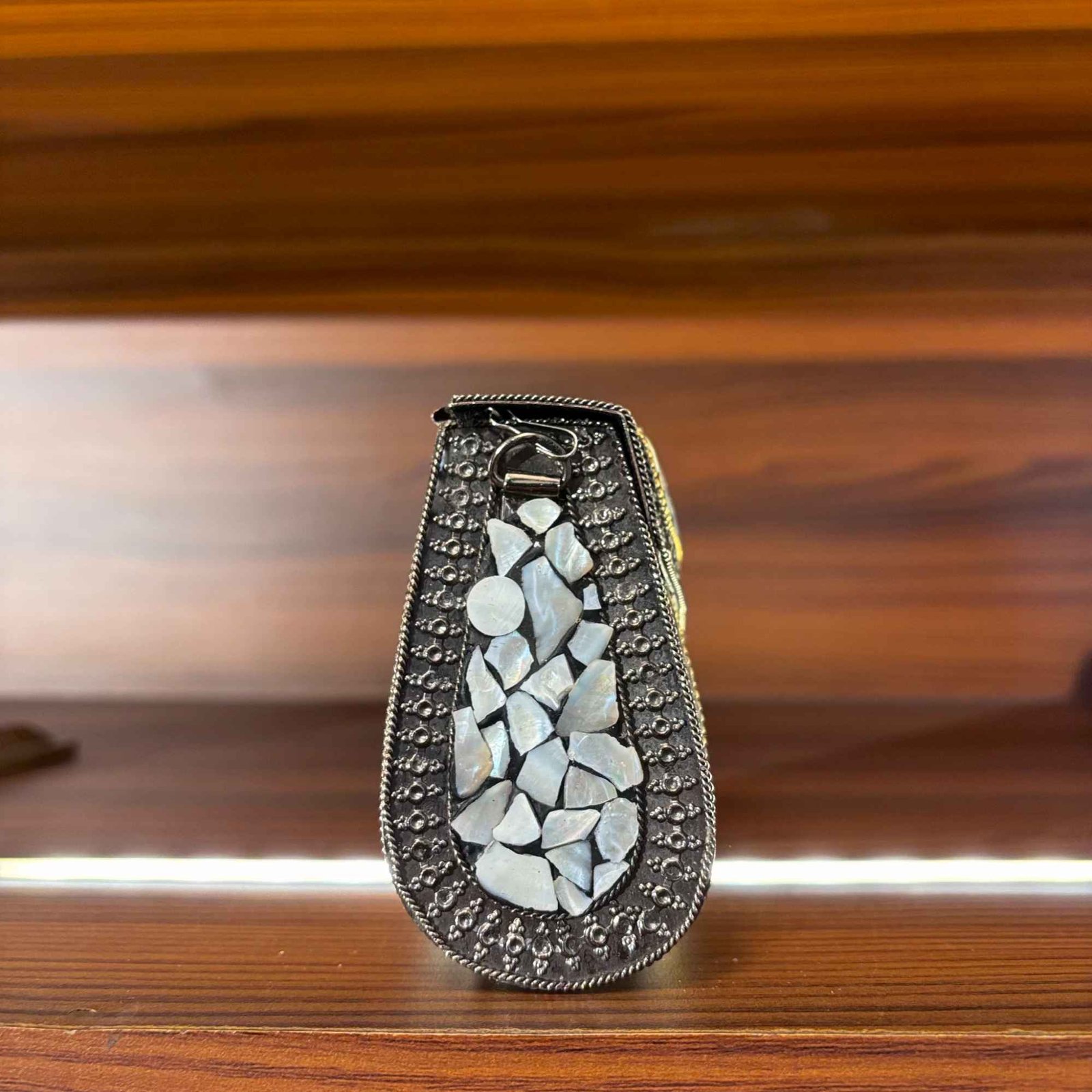 Dark, moody, and absolutely majestic—the Kohinoor Shard Clutch features hand-set mirror-like stone shards on a black metal base, framed with antique brass and gold floral inlays. This clutch is high on contrast and craftsmanship, designed to catch every glint of light and every ounce of attention.
