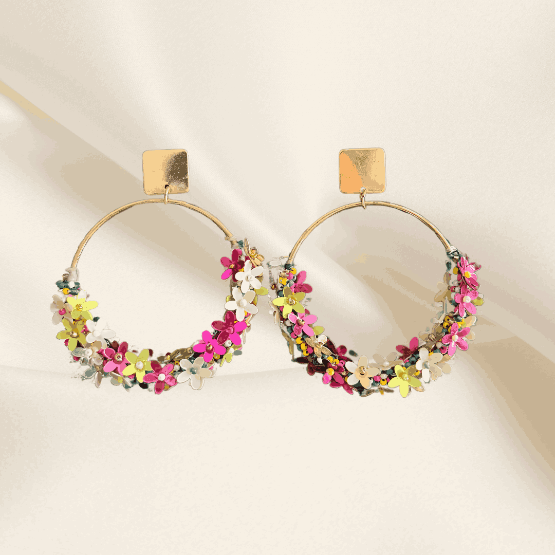 Bursts of colourful sequin flowers on elegant golden hoops