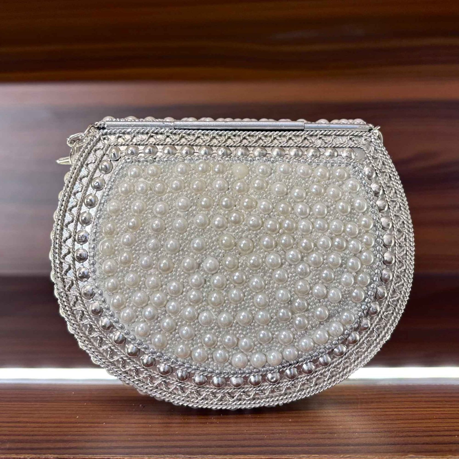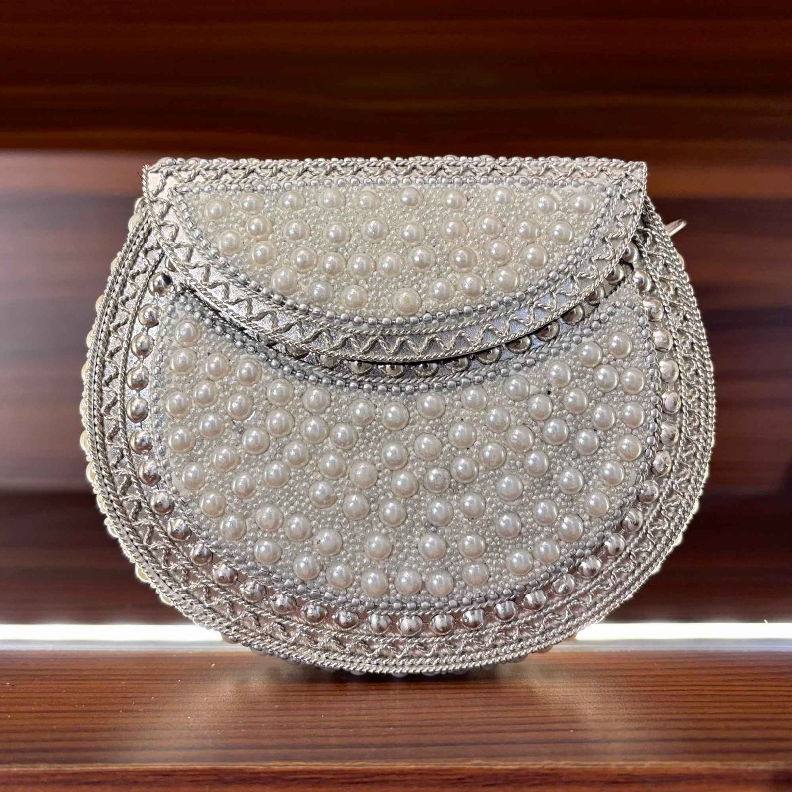 The Sheer Pearl Crescent is pure sophistication wrapped in silver and pearls. With a moon-shaped silhouette and layered pearl embellishments bordered by intricate filigree, this bag exudes understated luxury. It’s delicate yet structured, dainty yet bold—made for moonlit nights and graceful entrances.
