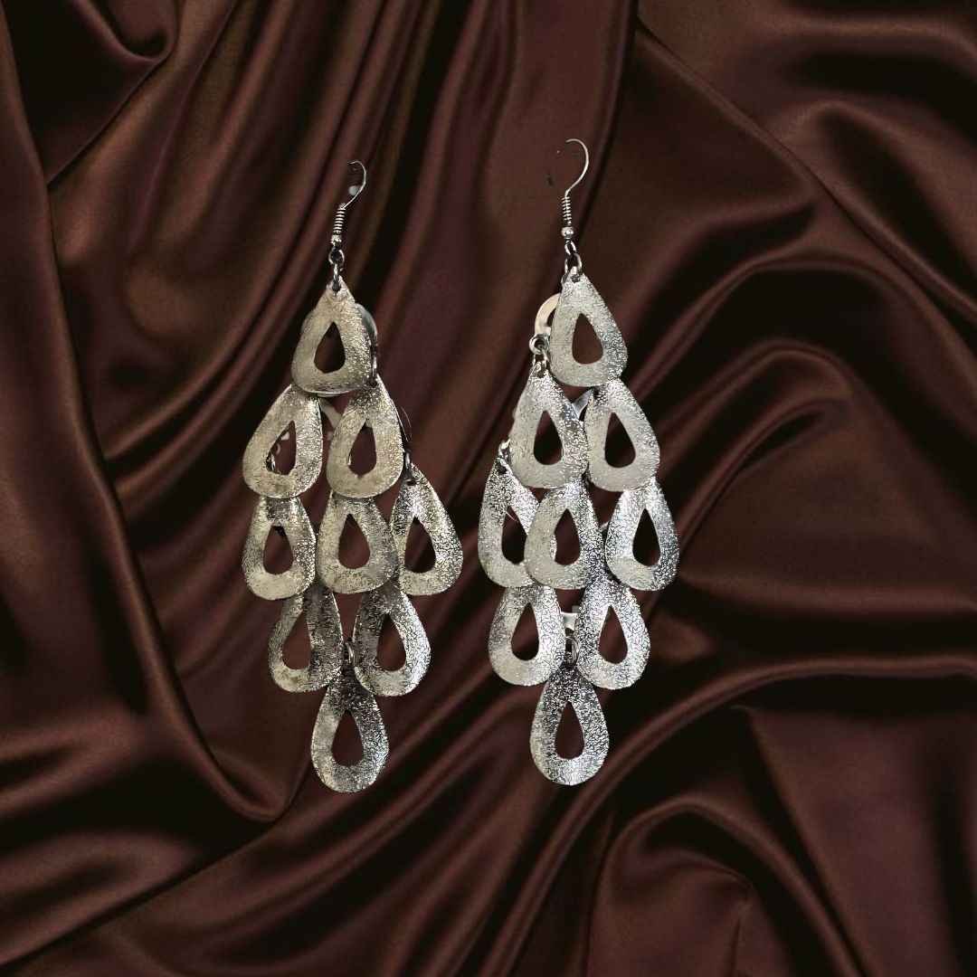 When elegance meets a little drama, you get Teardrop Tango. These cascading silver-toned danglers move like a dance – fluid, bold, and impossible to ignore. Designed with layered tear-shaped cutouts, they catch the light (and compliments) with every turn of your head.